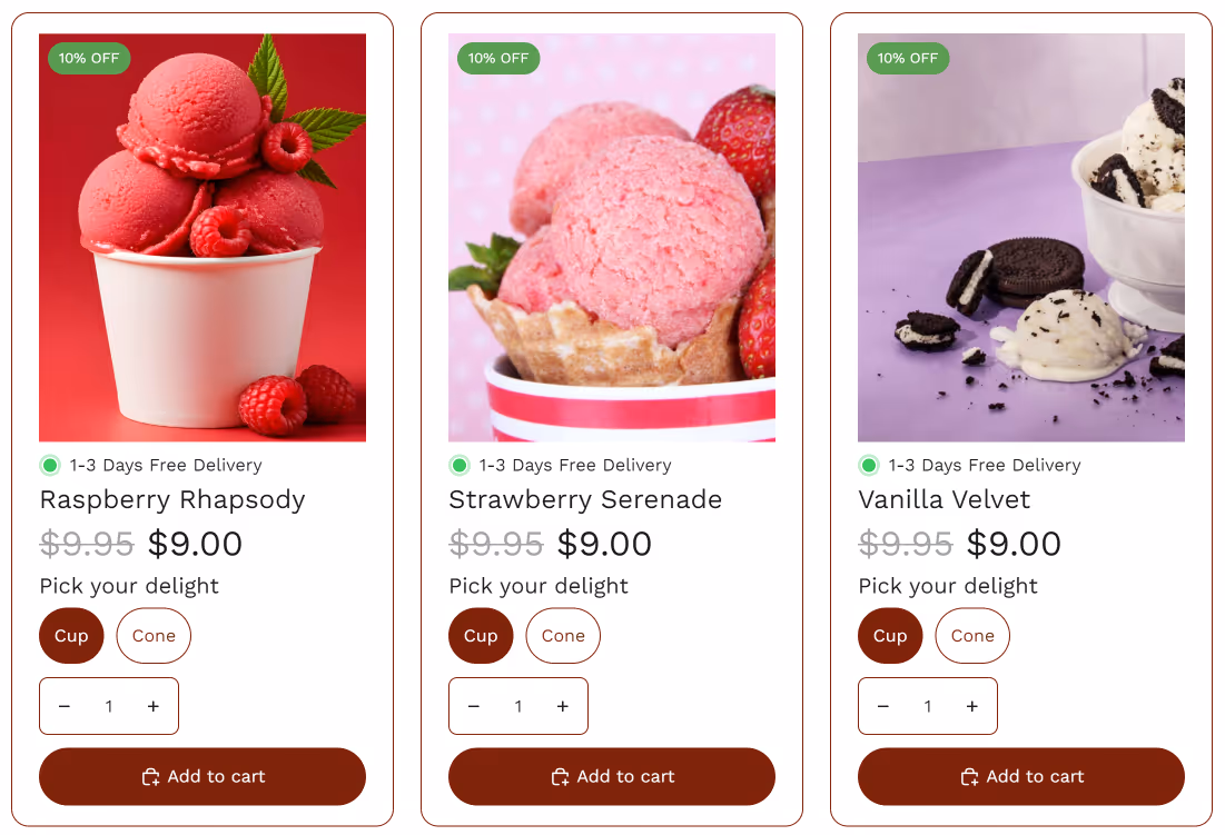My product cards don't just display items—they create urgency and desire. Strategic discount badges, clear pricing, and instant add-to-cart functionality eliminate every barrier between browsing and buying.